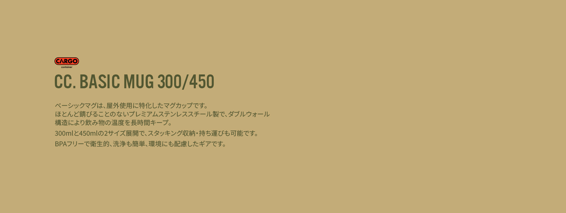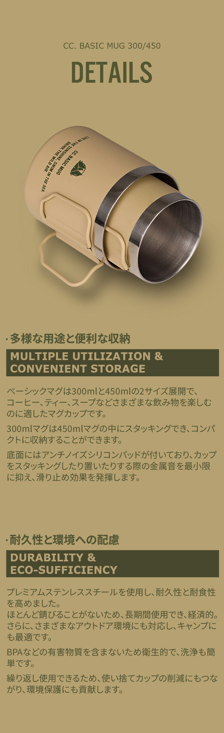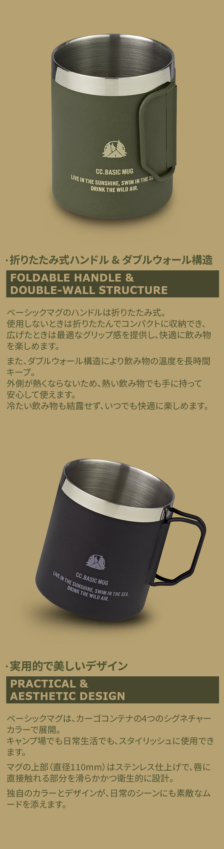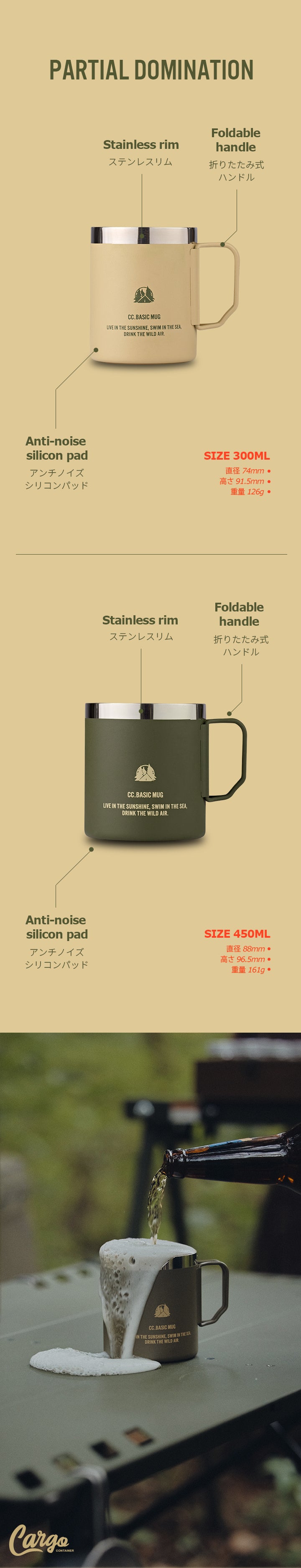 300mlと450mlの2サイズ展開で、キャンプでも自宅でも活躍する万能マグです。