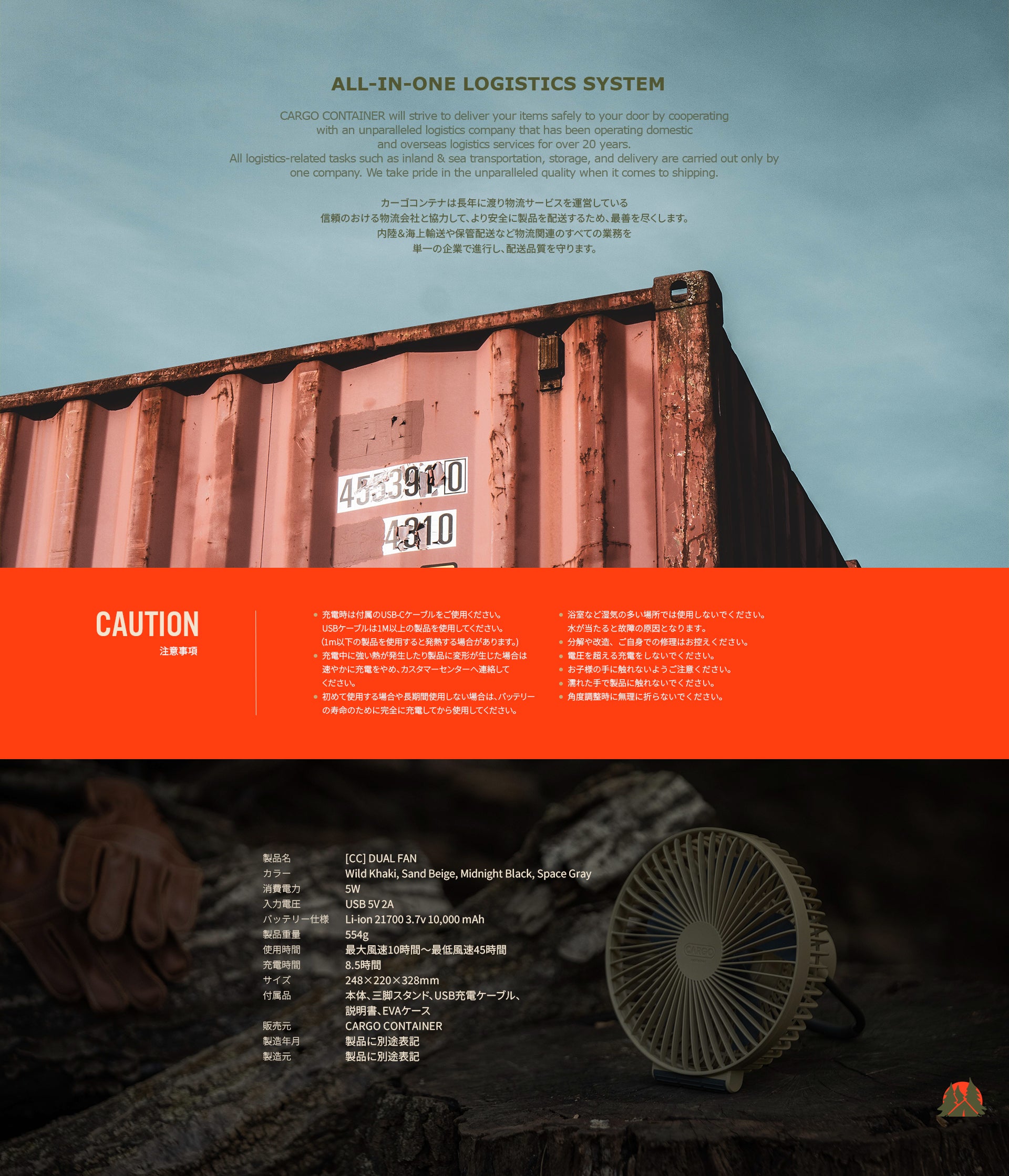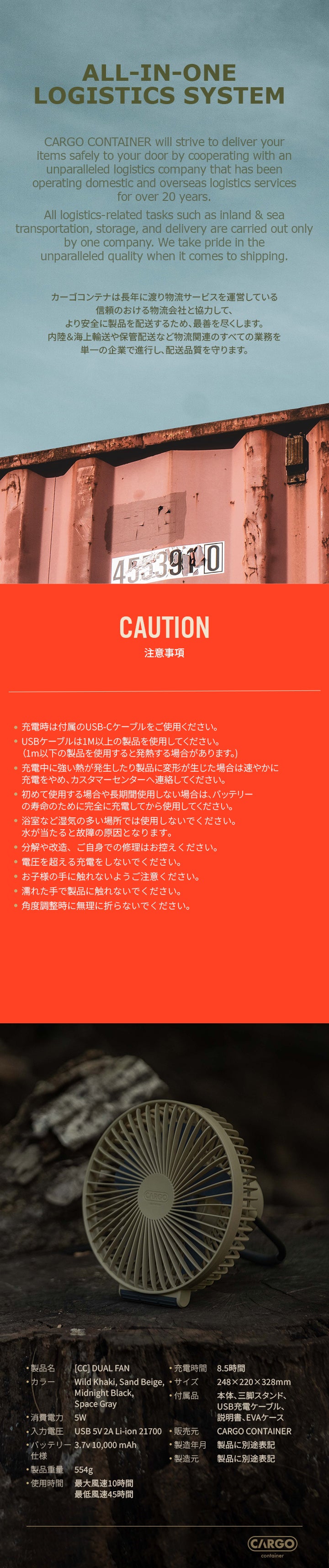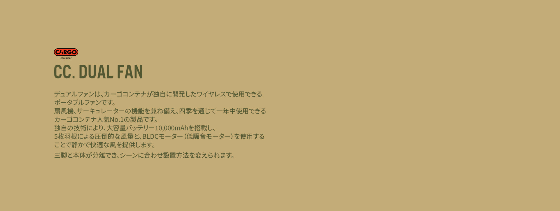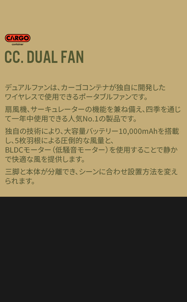 デュアルファンはカーゴコンテナが独自に開発した、ワイヤレスで使用できるポータブルファンです。