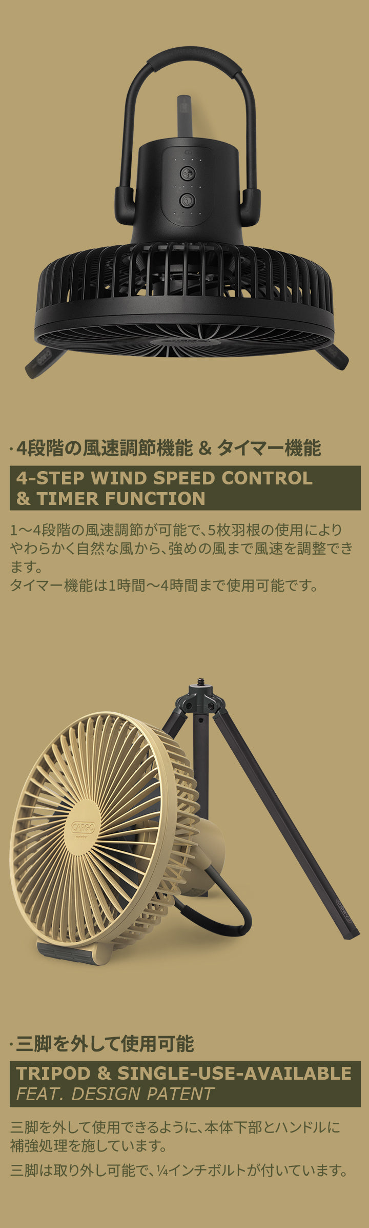 独自の技術により、大容量バッテリー10,000mAhを使用し、5枚羽根による圧倒的な風量と、BLDCモーター(低騒音モーター) を使用することで静かで快適な風を提供します。
