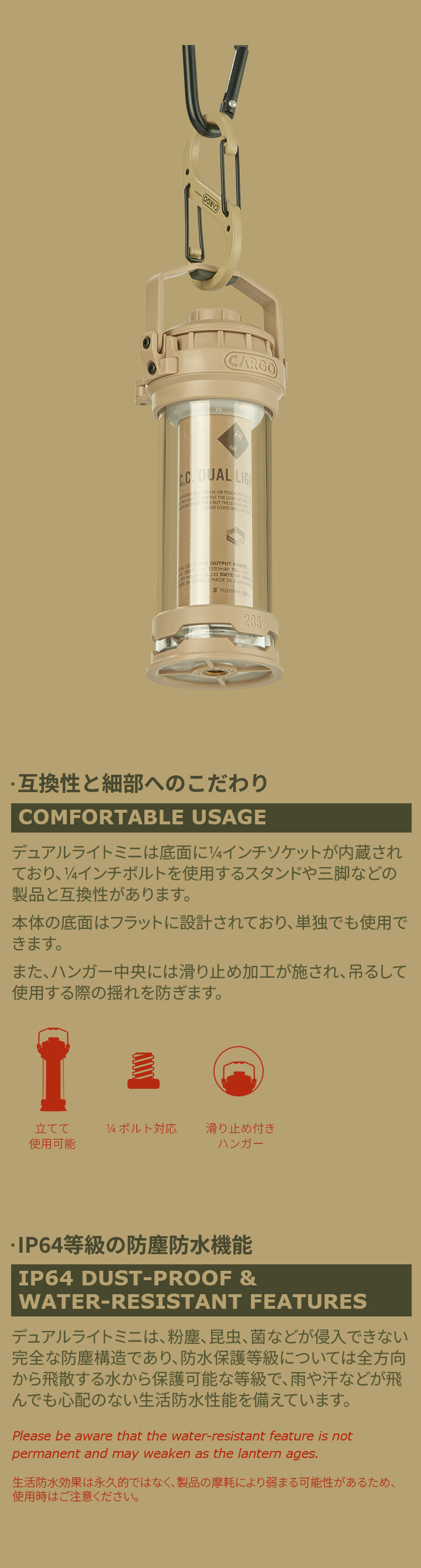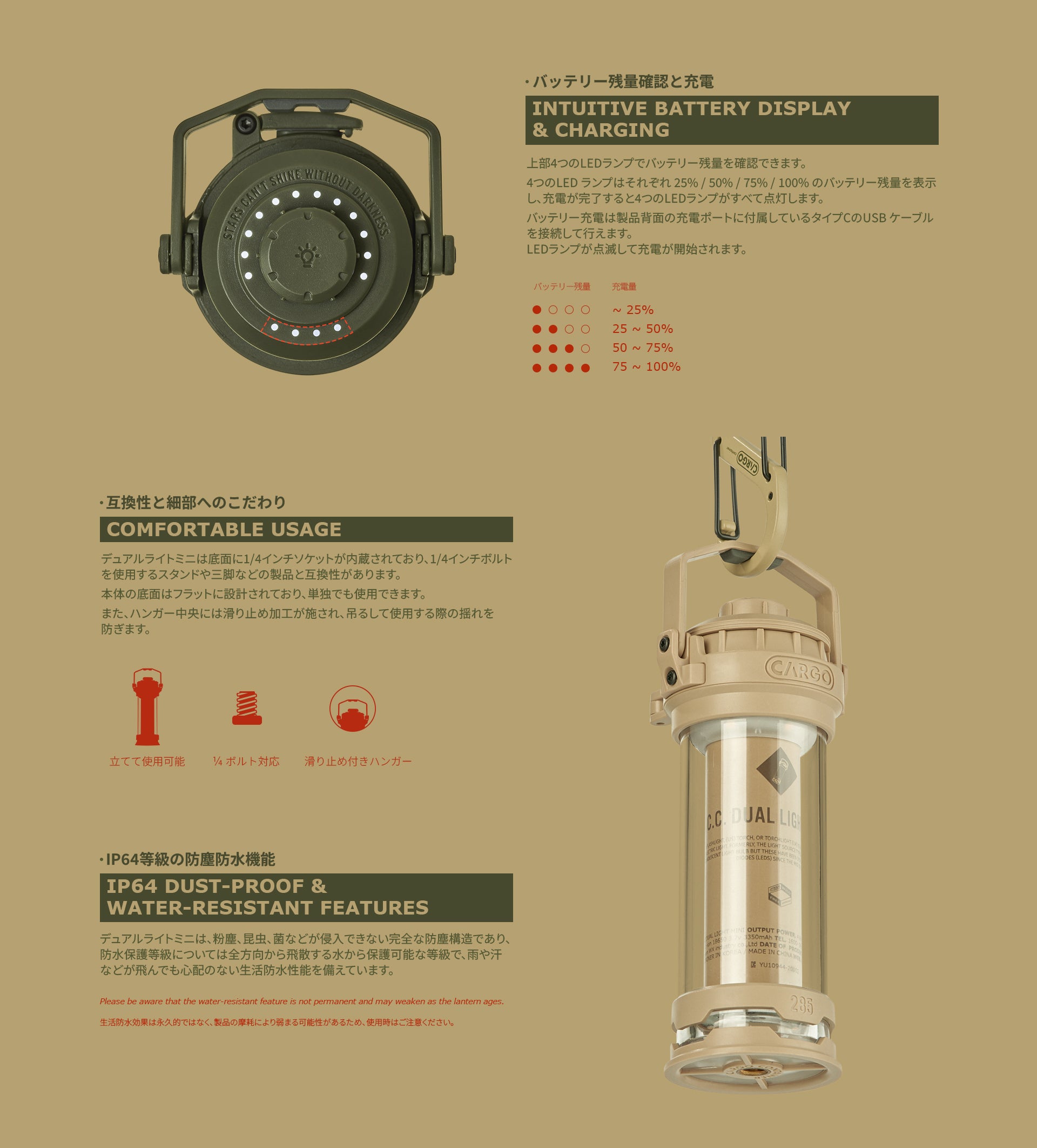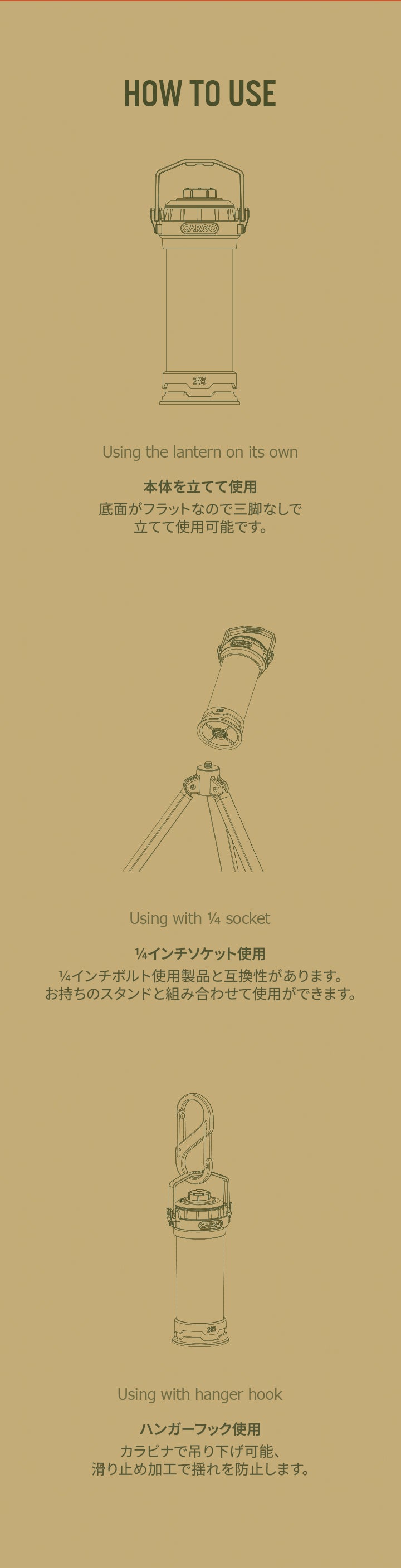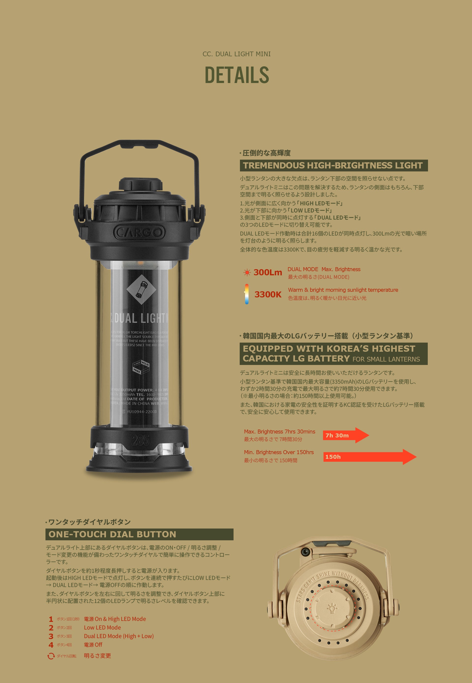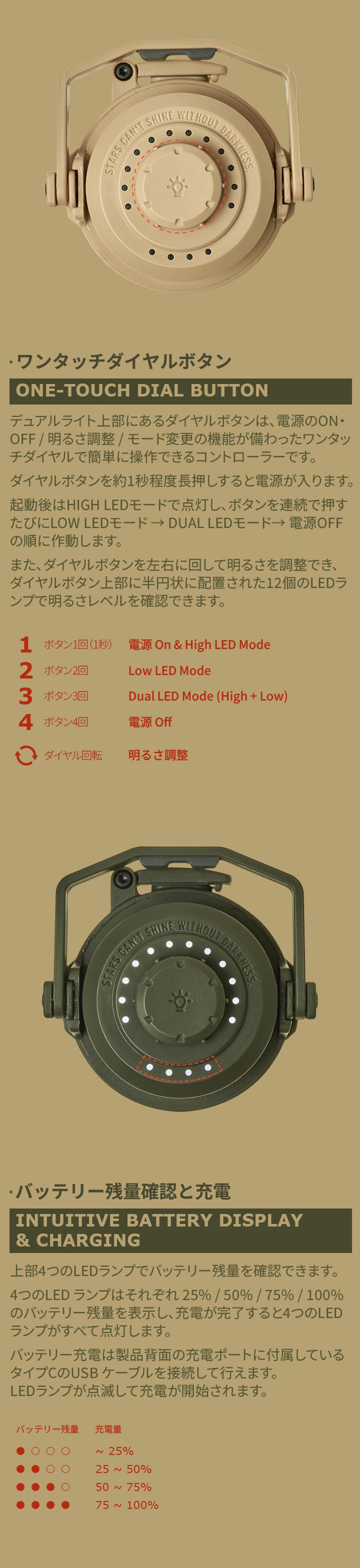 LOW - HIGH - LOW & HIGHの3段階のLEDモードで使用できるよう設計され、操作の簡単 なワンタッチダイヤルボタンで電源のON/OFF、モード変更、明るさ調整が可能です。